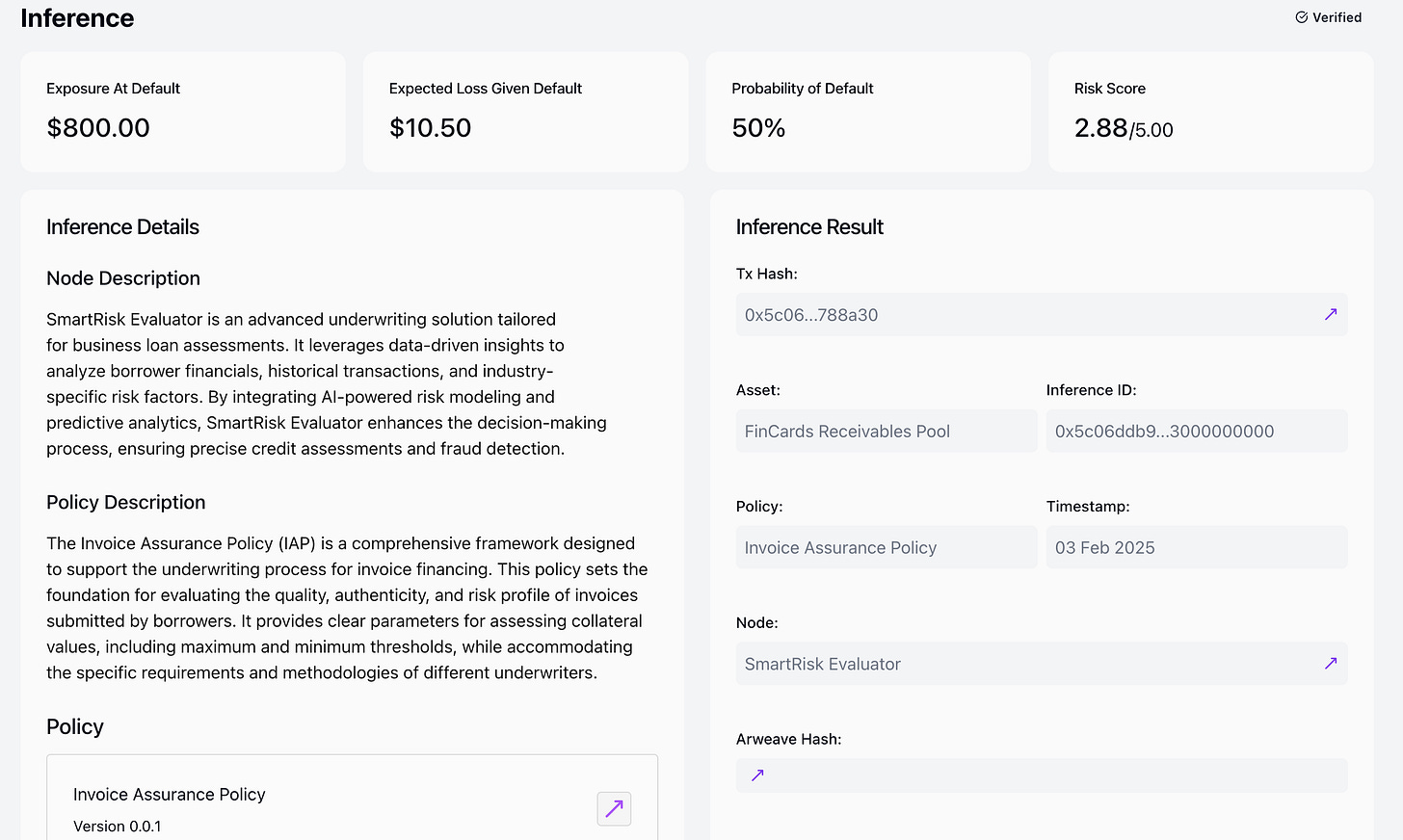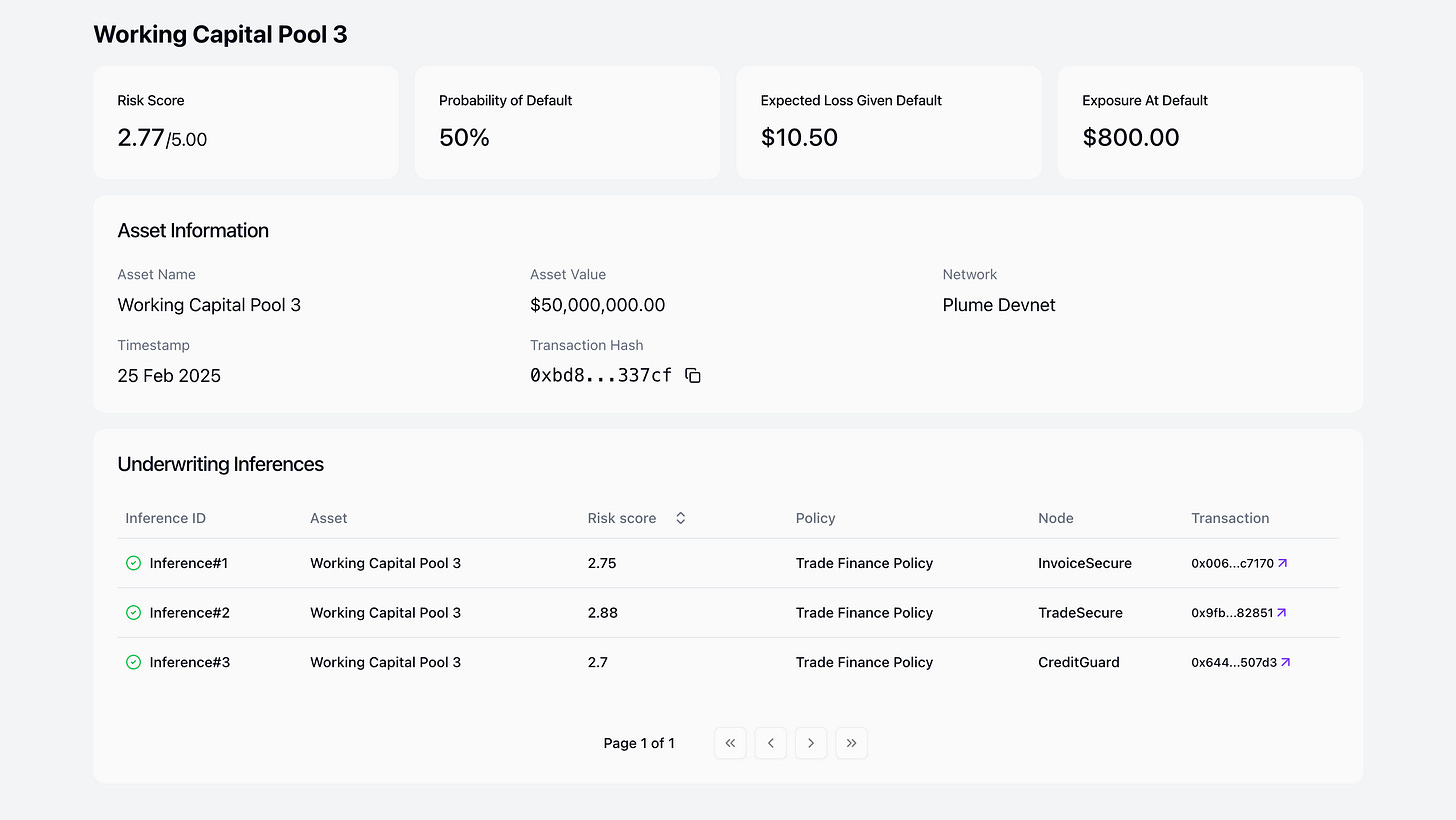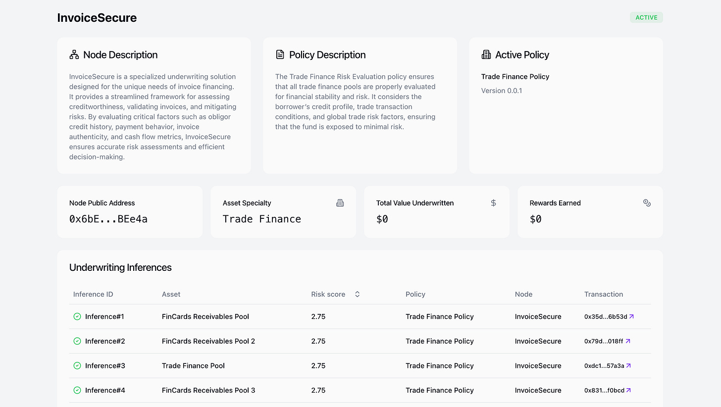 Credit underwriting has been a black box for too long. Bad actors in TradFi hide risk under layers of bureaucracy. Most of under-collateralised DeFi lending protocols lack visibility into how these lending decisions are made. We built the underwriting network for this, where multiple nodes publish underwriting decision on the same asset making sure we get holistic risk evaluation for the assets. For anyone to check this and verify, We built the explorer where you can see the full underwriting details and proof verification.