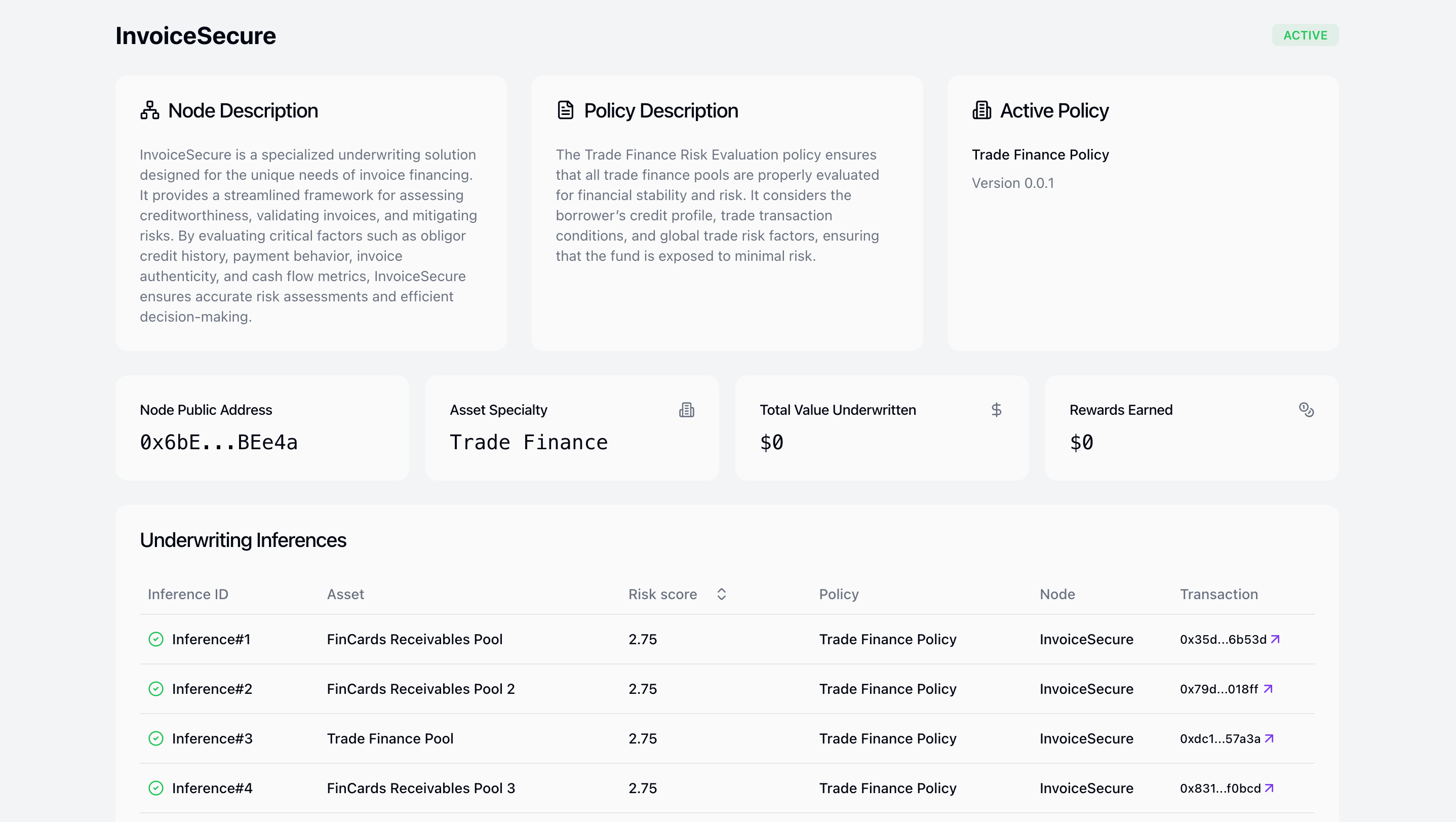 Nodes are specialized entities running underwriting models. Each underwriter operates independently, deploying risk models that assess real-world assets against pre-set policies.